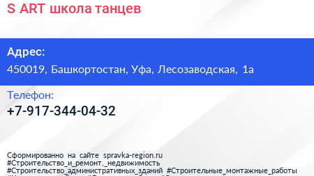 S-АRT, школа танцев по адресу 450019, Башкортостан, Уфа, Лесозаводская, 1а в дальнейшем Организация, размещена в следующих категориях: