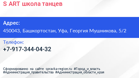 S-АRT, школа танцев по адресу 450043, Башкортостан, Уфа, Георгия Мушникова, 5/2 в дальнейшем Организация, размещена в следующих категориях:
