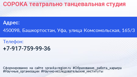 СОРОКА, театрально-танцевальная студия по адресу 450098, Башкортостан, Уфа, улица Комсомольская, 165/3 в дальнейшем Организация, размещена в следующих категориях: