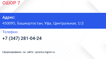 СШОР №7 по адресу 450095, Башкортостан, Уфа, Центральная, 1/2 в дальнейшем Организация, размещена в следующих категориях: