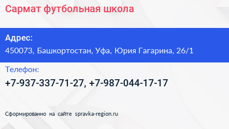 Сармат, футбольная школа по адресу 450073, Башкортостан, Уфа, Юрия Гагарина, 26/1 в дальнейшем Организация, размещена в следующих категориях: