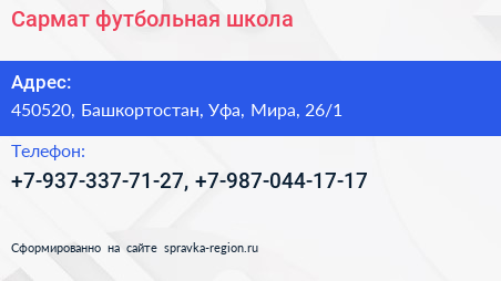 Сармат, футбольная школа по адресу 450520, Башкортостан, Уфа, Мира, 26/1 в дальнейшем Организация, размещена в следующих категориях: