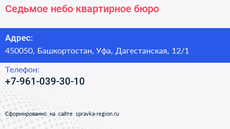 Седьмое небо, квартирное бюро по адресу 450050, Башкортостан, Уфа, Дагестанская, 12/1 в дальнейшем Организация, размещена в следующих категориях: