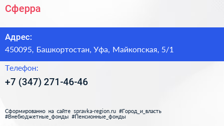 Сферра по адресу 450095, Башкортостан, Уфа, Майкопская, 5/1 в дальнейшем Организация, размещена в следующих категориях: