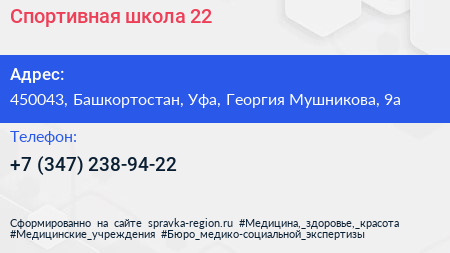 Спортивная школа №22 по адресу 450043, Башкортостан, Уфа, Георгия Мушникова, 9а в дальнейшем Организация, размещена в следующих категориях: