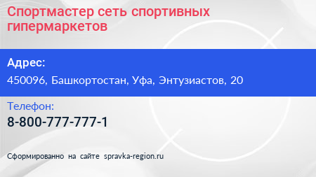 Спортмастер, сеть спортивных гипермаркетов по адресу 450096, Башкортостан, Уфа, Энтузиастов, 20 в дальнейшем Организация, размещена в следующих категориях: