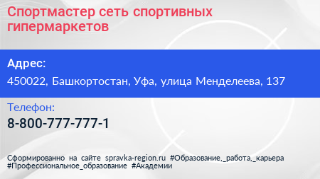 Спортмастер, сеть спортивных гипермаркетов по адресу 450022, Башкортостан, Уфа, улица Менделеева, 137 в дальнейшем Организация, размещена в следующих категориях: