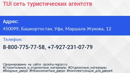 TUI, сеть туристических агентств по адресу 450099, Башкортостан, Уфа, Маршала Жукова, 12 в дальнейшем Организация, размещена в следующих категориях: