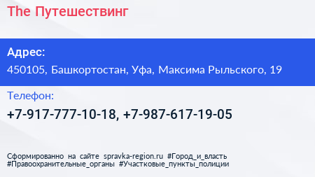 The Путешествинг по адресу 450105, Башкортостан, Уфа, Максима Рыльского, 19 в дальнейшем Организация, размещена в следующих категориях: