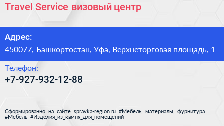 Travel Service, визовый центр по адресу 450077, Башкортостан, Уфа, Верхнеторговая площадь, 1 в дальнейшем Организация, размещена в следующих категориях: