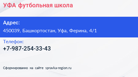 УФА, футбольная школа по адресу 450039, Башкортостан, Уфа, Ферина, 4/1 в дальнейшем Организация, размещена в следующих категориях: