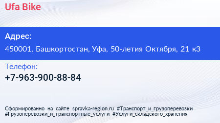 Ufa-Bike по адресу 450001, Башкортостан, Уфа, 50-летия Октября, 21 к3 в дальнейшем Организация, размещена в следующих категориях: