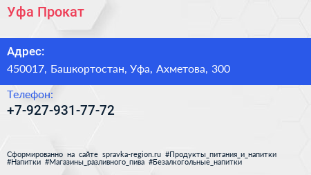 Уфа-Прокат по адресу 450017, Башкортостан, Уфа, Ахметова, 300 в дальнейшем Организация, размещена в следующих категориях: