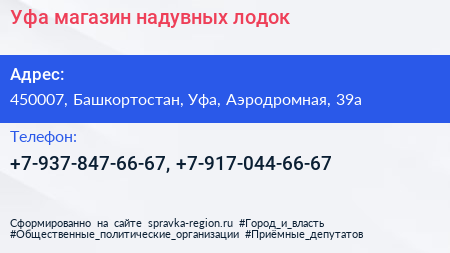 Уфа, магазин надувных лодок по адресу 450007, Башкортостан, Уфа, Аэродромная, 39а в дальнейшем Организация, размещена в следующих категориях: