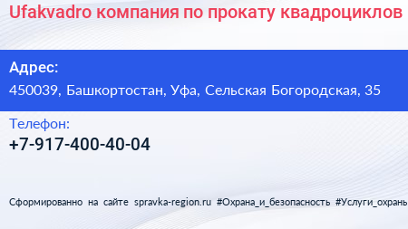 Ufakvadro, компания по прокату квадроциклов по адресу 450039, Башкортостан, Уфа, Сельская Богородская, 35 в дальнейшем Организация, размещена в следующих категориях: