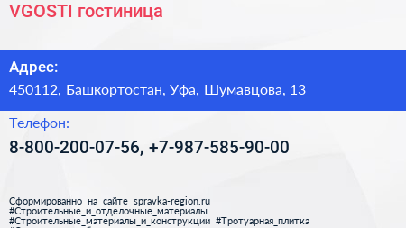 VGOSTI, гостиница по адресу 450112, Башкортостан, Уфа, Шумавцова, 13 в дальнейшем Организация, размещена в следующих категориях: