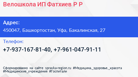 Велошкола, ИП Фатхиев Р.Р. по адресу 450047, Башкортостан, Уфа, Бакалинская, 27 в дальнейшем Организация, размещена в следующих категориях: