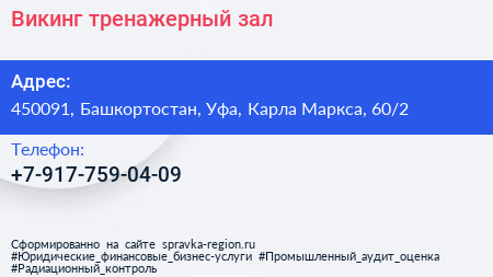 Викинг, тренажерный зал по адресу 450091, Башкортостан, Уфа, Карла Маркса, 60/2 в дальнейшем Организация, размещена в следующих категориях: