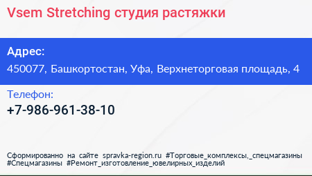 Vsem Stretching, студия растяжки по адресу 450077, Башкортостан, Уфа, Верхнеторговая площадь, 4 в дальнейшем Организация, размещена в следующих категориях: