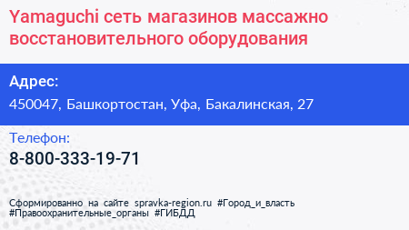Yamaguchi, сеть магазинов массажно-восстановительного оборудования по адресу 450047, Башкортостан, Уфа, Бакалинская, 27 в дальнейшем Организация, размещена в следующих категориях: