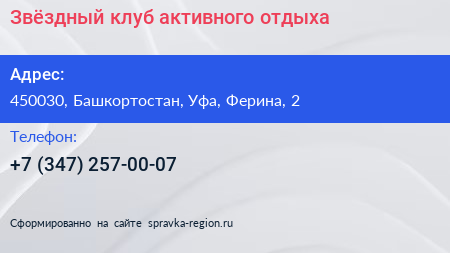 Звёздный, клуб активного отдыха по адресу 450030, Башкортостан, Уфа, Ферина, 2 в дальнейшем Организация, размещена в следующих категориях: