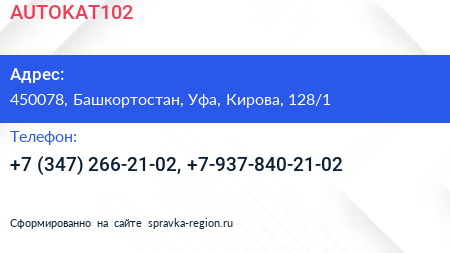 AUTOKAT102 по адресу 450078, Башкортостан, Уфа, Кирова, 128/1 в дальнейшем Организация, размещена в следующих категориях: