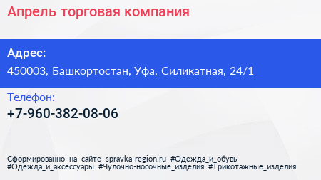 Апрель, торговая компания по адресу 450003, Башкортостан, Уфа, Силикатная, 24/1 в дальнейшем Организация, размещена в следующих категориях: