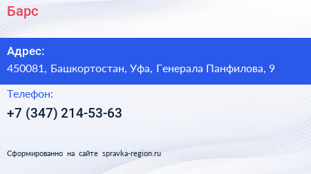 Барс по адресу 450081, Башкортостан, Уфа, Генерала Панфилова, 9 в дальнейшем Организация, размещена в следующих категориях: