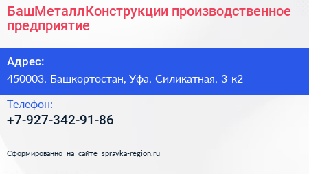 БашМеталлКонструкции, производственное предприятие по адресу 450003, Башкортостан, Уфа, Силикатная, 3 к2 в дальнейшем Организация, размещена в следующих категориях: