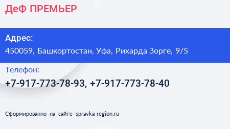 ДеФ-ПРЕМЬЕР по адресу 450059, Башкортостан, Уфа, Рихарда Зорге, 9/5 в дальнейшем Организация, размещена в следующих категориях:
