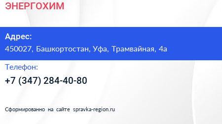 ЭНЕРГОХИМ по адресу 450027, Башкортостан, Уфа, Трамвайная, 4а в дальнейшем Организация, размещена в следующих категориях:
