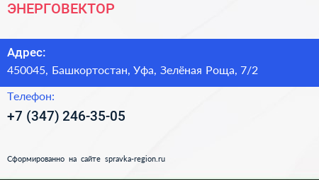 ЭНЕРГОВЕКТОР по адресу 450045, Башкортостан, Уфа, Зелёная Роща, 7/2 в дальнейшем Организация, размещена в следующих категориях: