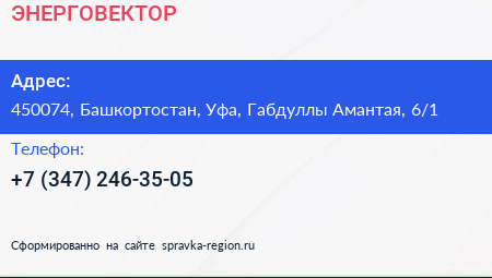 ЭНЕРГОВЕКТОР по адресу 450074, Башкортостан, Уфа, Габдуллы Амантая, 6/1 в дальнейшем Организация, размещена в следующих категориях: