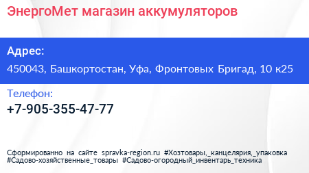 ЭнергоМет, магазин аккумуляторов по адресу 450043, Башкортостан, Уфа, Фронтовых Бригад, 10 к25 в дальнейшем Организация, размещена в следующих категориях: