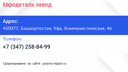 Евродеталь, завод по адресу 450077, Башкортостан, Уфа, Коммунистическая, 46 в дальнейшем Организация, размещена в следующих категориях: