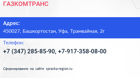 ГАЗКОМТРАНС по адресу 450027, Башкортостан, Уфа, Трамвайная, 2г в дальнейшем Организация, размещена в следующих категориях: