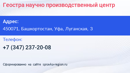 Геостра, научно-производственный центр по адресу 450071, Башкортостан, Уфа, Луганская, 3 в дальнейшем Организация, размещена в следующих категориях: