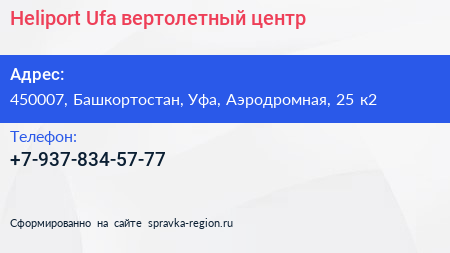 Heliport Ufa, вертолетный центр по адресу 450007, Башкортостан, Уфа, Аэродромная, 25 к2 в дальнейшем Организация, размещена в следующих категориях: