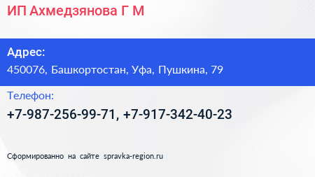 ИП Ахмедзянова Г.М. по адресу 450076, Башкортостан, Уфа, Пушкина, 79 в дальнейшем Организация, размещена в следующих категориях: