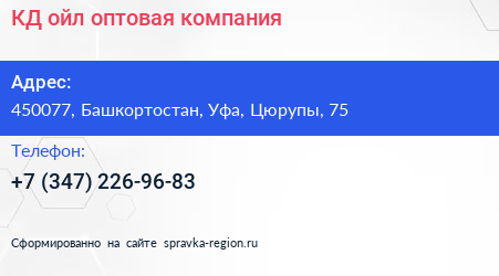 КД-ойл, оптовая компания по адресу 450077, Башкортостан, Уфа, Цюрупы, 75 в дальнейшем Организация, размещена в следующих категориях: