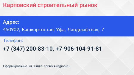 Карповский строительный рынок по адресу 450902, Башкортостан, Уфа, Ландшафтная, 7 в дальнейшем Организация, размещена в следующих категориях: