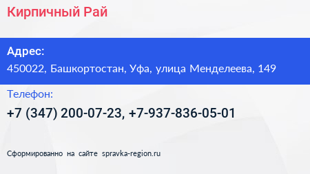 Кирпичный Рай по адресу 450022, Башкортостан, Уфа, улица Менделеева, 149 в дальнейшем Организация, размещена в следующих категориях: