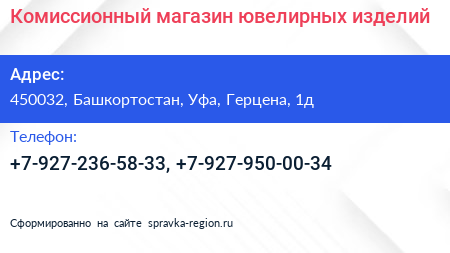 Комиссионный магазин ювелирных изделий по адресу 450032, Башкортостан, Уфа, Герцена, 1д в дальнейшем Организация, размещена в следующих категориях: