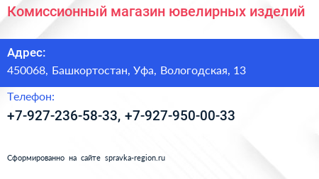 Комиссионный магазин ювелирных изделий по адресу 450068, Башкортостан, Уфа, Вологодская, 13 в дальнейшем Организация, размещена в следующих категориях: