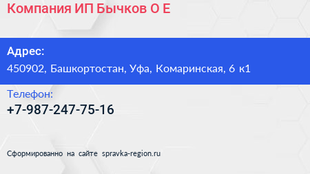 Компания, ИП Бычков О.Е. по адресу 450902, Башкортостан, Уфа, Комаринская, 6 к1 в дальнейшем Организация, размещена в следующих категориях:
