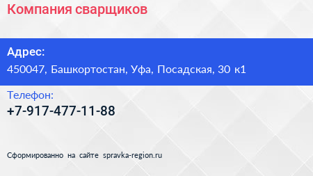 Компания сварщиков по адресу 450047, Башкортостан, Уфа, Посадская, 30 к1 в дальнейшем Организация, размещена в следующих категориях: