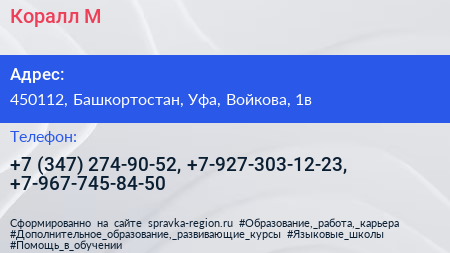 Коралл-М по адресу 450112, Башкортостан, Уфа, Войкова, 1в в дальнейшем Организация, размещена в следующих категориях: