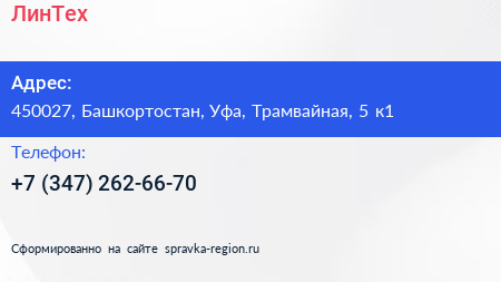 ЛинТех по адресу 450027, Башкортостан, Уфа, Трамвайная, 5 к1 в дальнейшем Организация, размещена в следующих категориях: