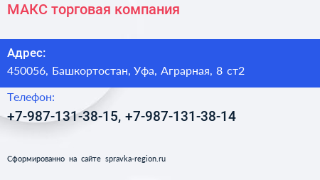 МАКС, торговая компания по адресу 450056, Башкортостан, Уфа, Аграрная, 8 ст2 в дальнейшем Организация, размещена в следующих категориях: