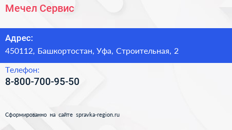 Мечел-Сервис по адресу 450112, Башкортостан, Уфа, Строительная, 2 в дальнейшем Организация, размещена в следующих категориях: